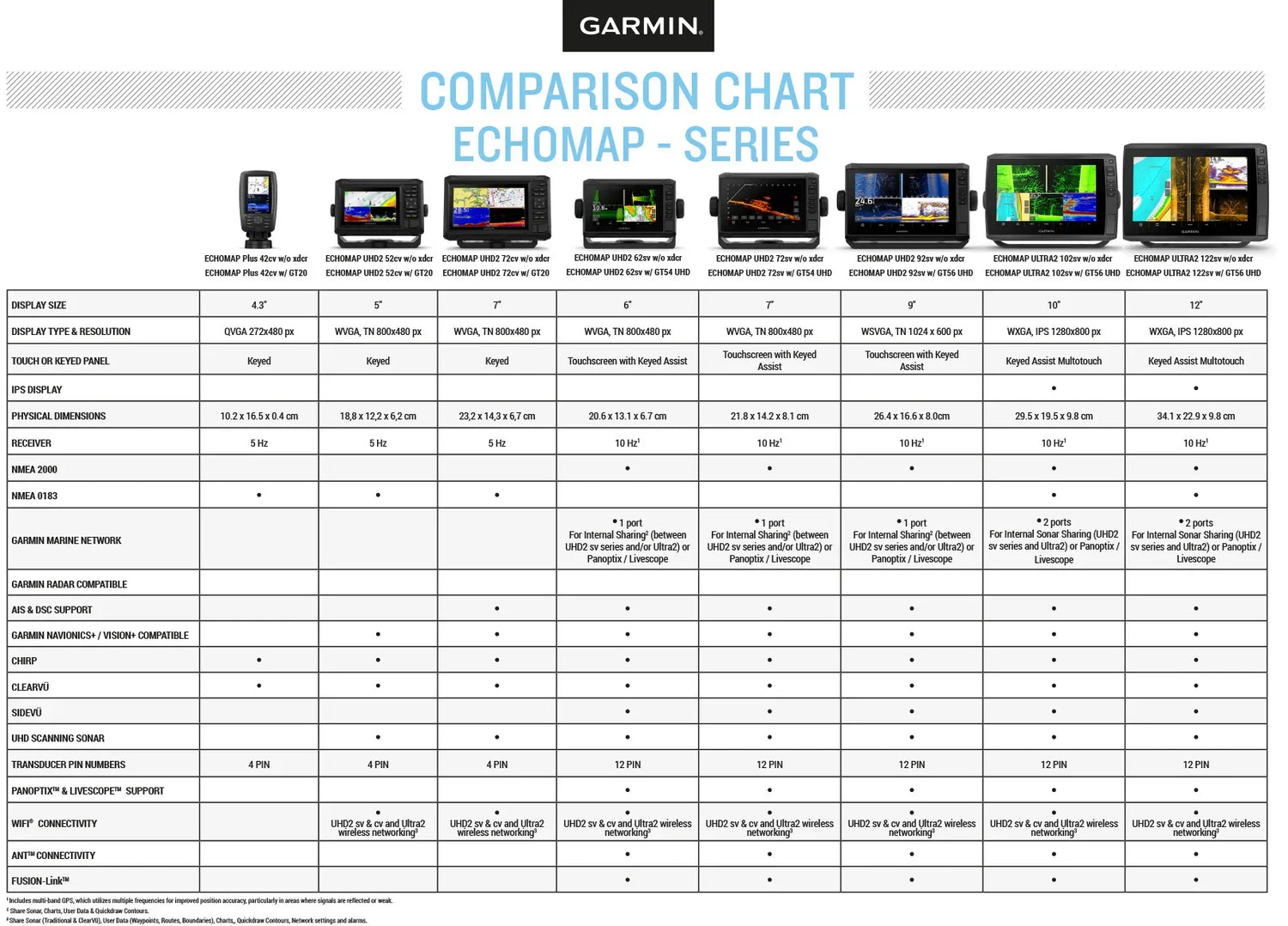 • Luotaintaajuudet: Perinteinen: Single Channel CHIRP, 50/77/83/200 kHz, L, M, H CHIRP Garmin ClearVü ja SideVü: 260/455/800/1000/1200 kHz
