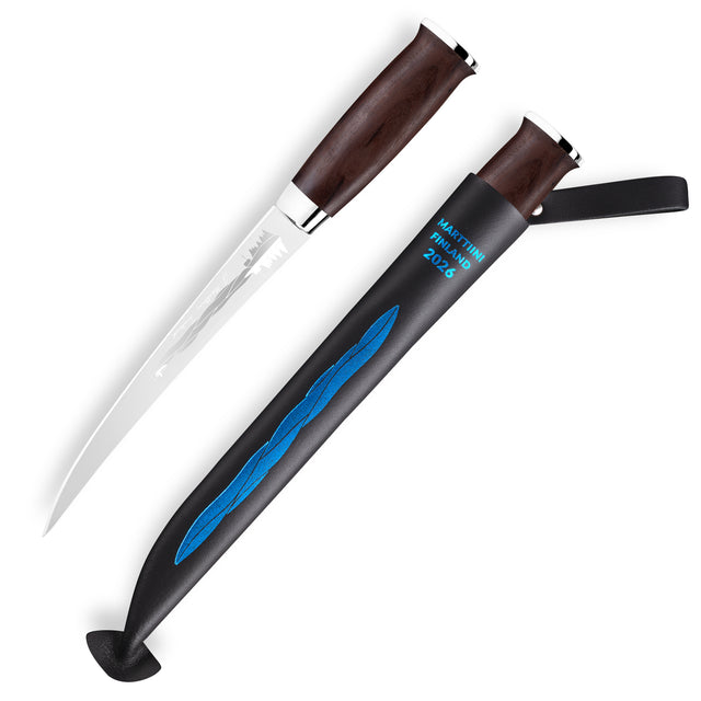 Marttiini Vuosipuukko 2026 Järvi Filetti yhdistää suomalaisen luonnon hiljaisen voiman ja käsityötaidon tarkkuuden. Se ei ole vain fileerausveitsi, vaan pala kotimaista järvitunnelmaa. Suunniteltu kulkemaan mukana hetkissä, jotka muistetaan pitkään.