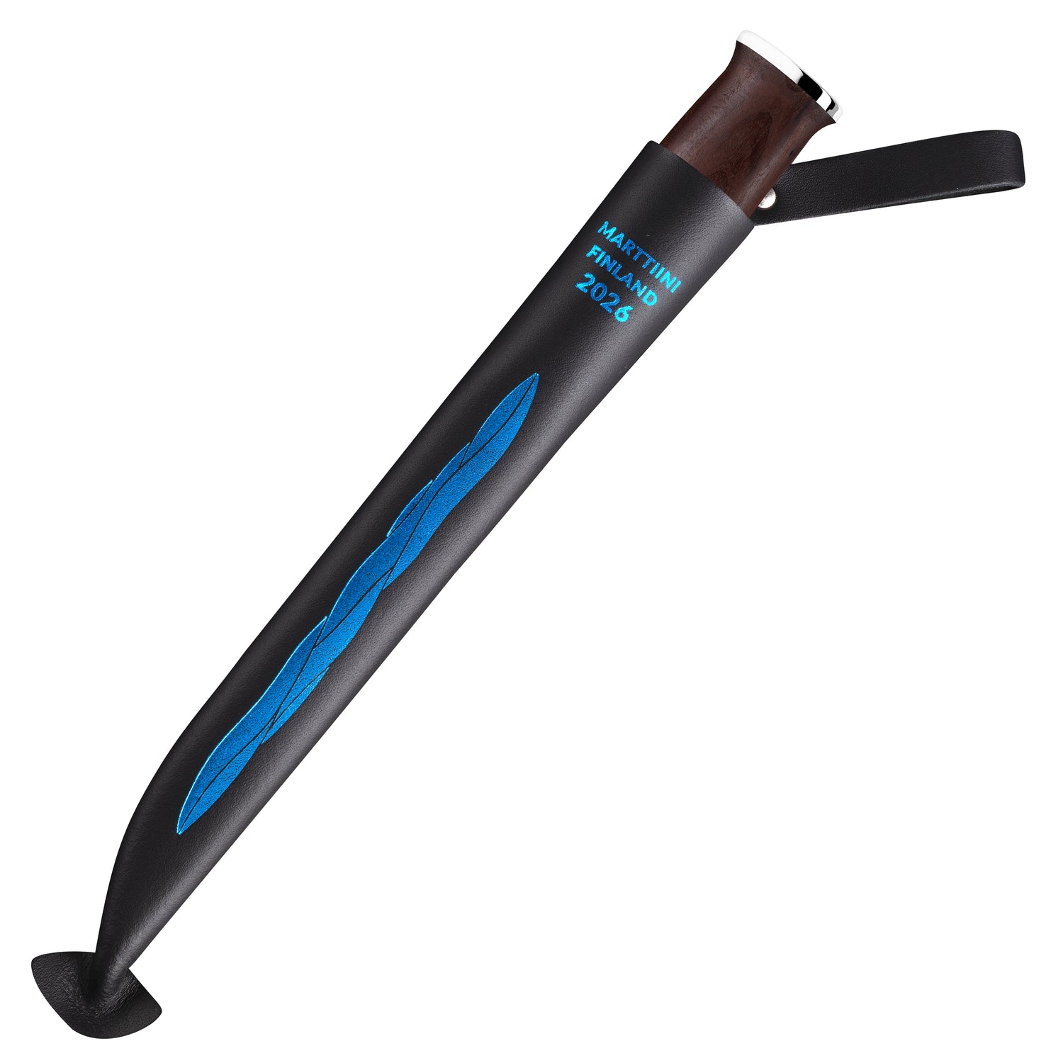 Puukon mukana toimitettava musta kromiparkittu nahkatuppi on koristeltu sinisellä foliopainatuksella, jossa näkyy järvimaisemasta ammennettu kuviointi. Se viimeistelee kokonaisuuden, joka on yhtä aikaa käyttöesine ja arvotaidetta.