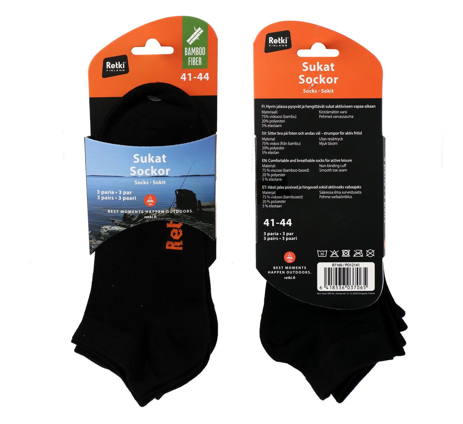 Kiristämätön varsi lisää käyttömukavuutta, vahvistettu pohja parantaa kestävyyttä ja pehmeä varvassauma ehkäisee hiertymiä. Kolmen parin pakkaus tarjoaa hyvän varaston kesäretkille tai arkikäyttöön.