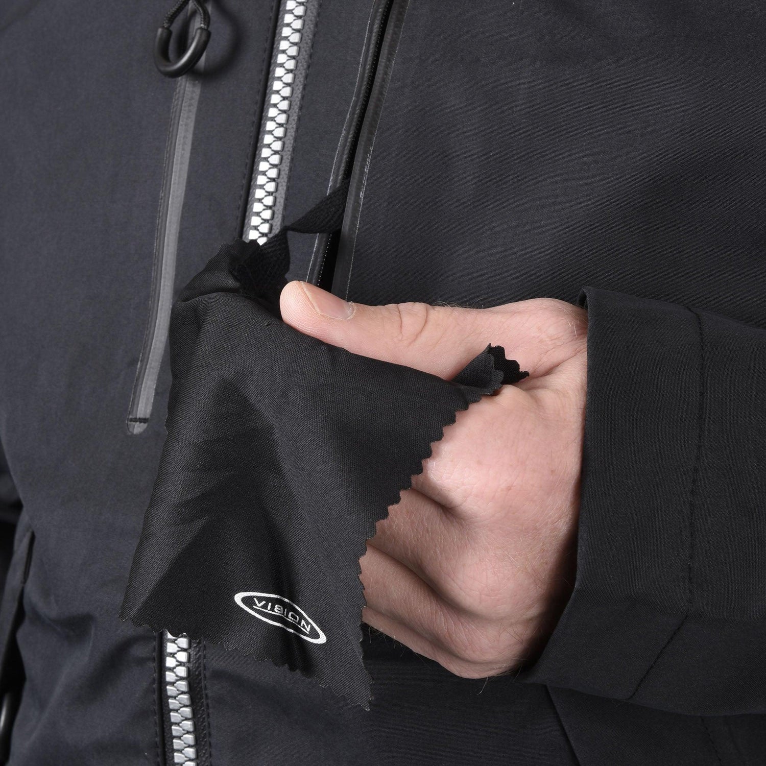 • Sisäänrakennettu aurinkolasien puhdistusliina vasemman rintataskun D‑renkaassa
