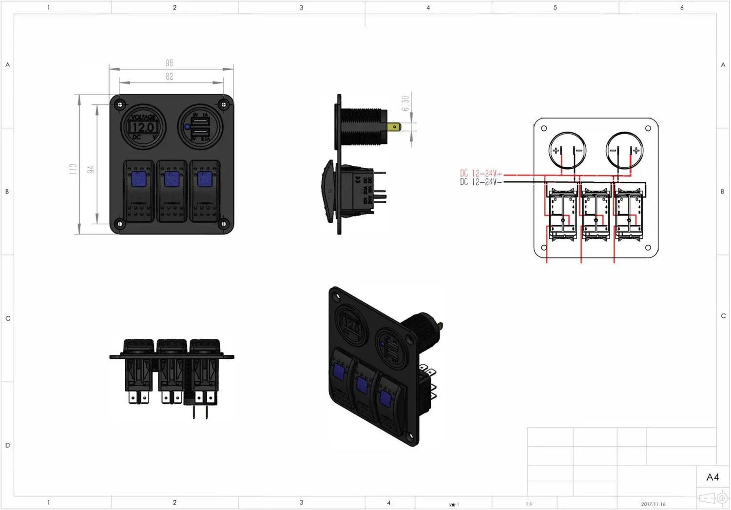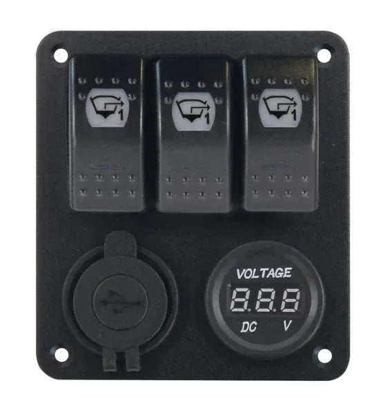 Brytarpanel med stadig aluminiumplatta, spänningsmätare och USB-utgång. Tre brytare, 12 V/20A eller 24 V/10A.