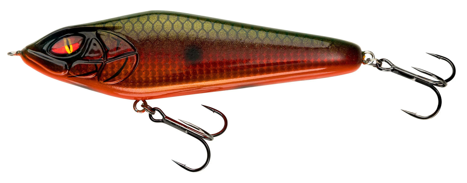 De infällda 3D Prorex-ögonen ger en tydlig huggpunkt och står emot tuffa tag. Denna jerkbait är utvecklad specifikt för gäddfiske, men den mindre storleken lockar även försiktigare eller trögare fiskar till hugg.