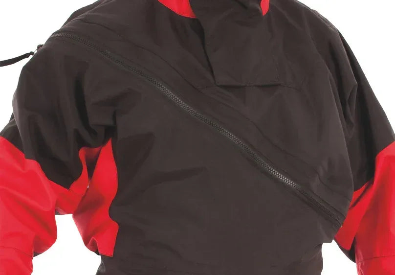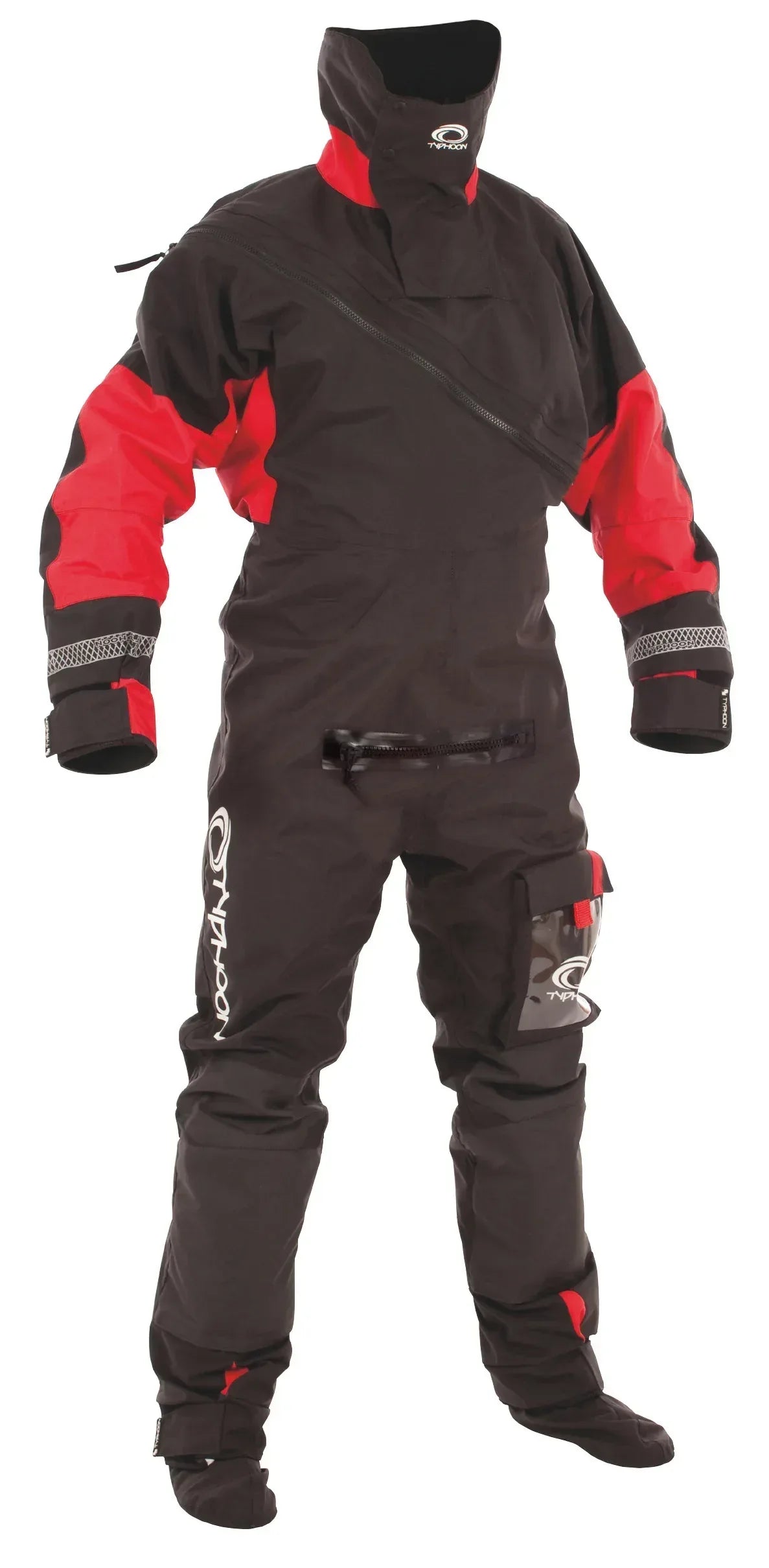 Typhoons MAX B är en klassisk torrdräkt som öppnas framtill. Den är full av väl genomtänkta och fungerande lösningar; bland annat stormkrage, lårficka och ett Aquaseal-blixtlås i plast.