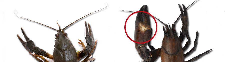 - Flodkräfta: Klornas färg matchar skalet och har tydliga knölar på sidan.